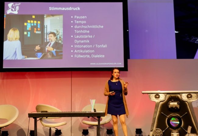 Keynote Speaker stimmen die Zuhörer auf ein Thema ein oder begleiten sie durch eine Veranstaltung. Als Keynote Speaker braucht man eine kraftvolle und angenehme Stimme. Vocal Coach Alexandra Pengler bietet Stimmtraining für kraftvolle Stimmen speziell für Keynote Speaker, Frauen und Männer in Führungspositionen und Schauspieler.